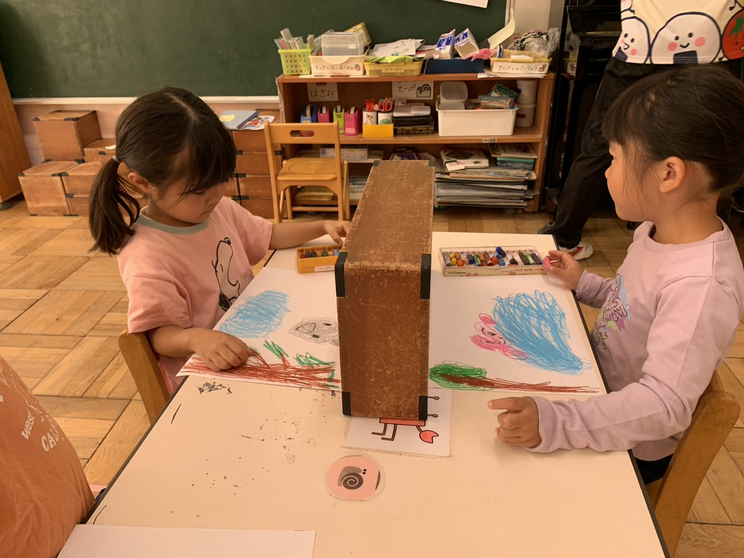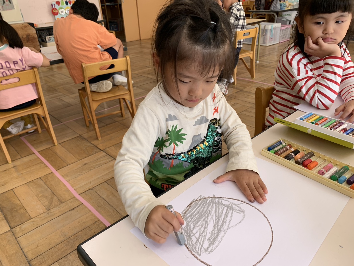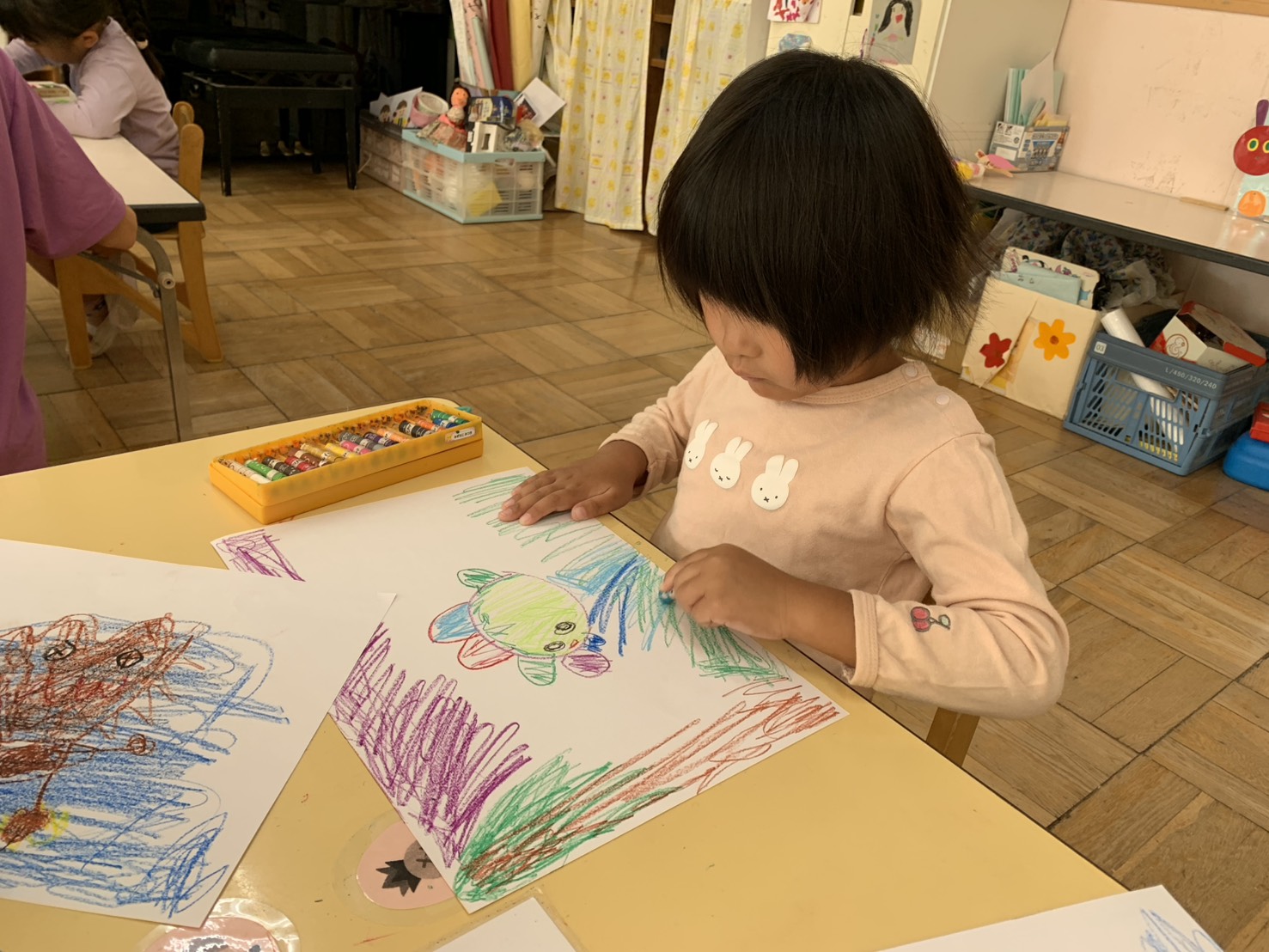 絵本のお話を、絵を見ないで聞き、印象に残った場面の絵を描きました☆