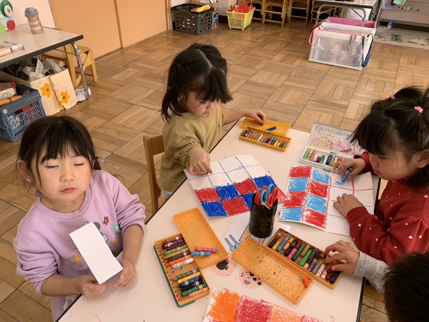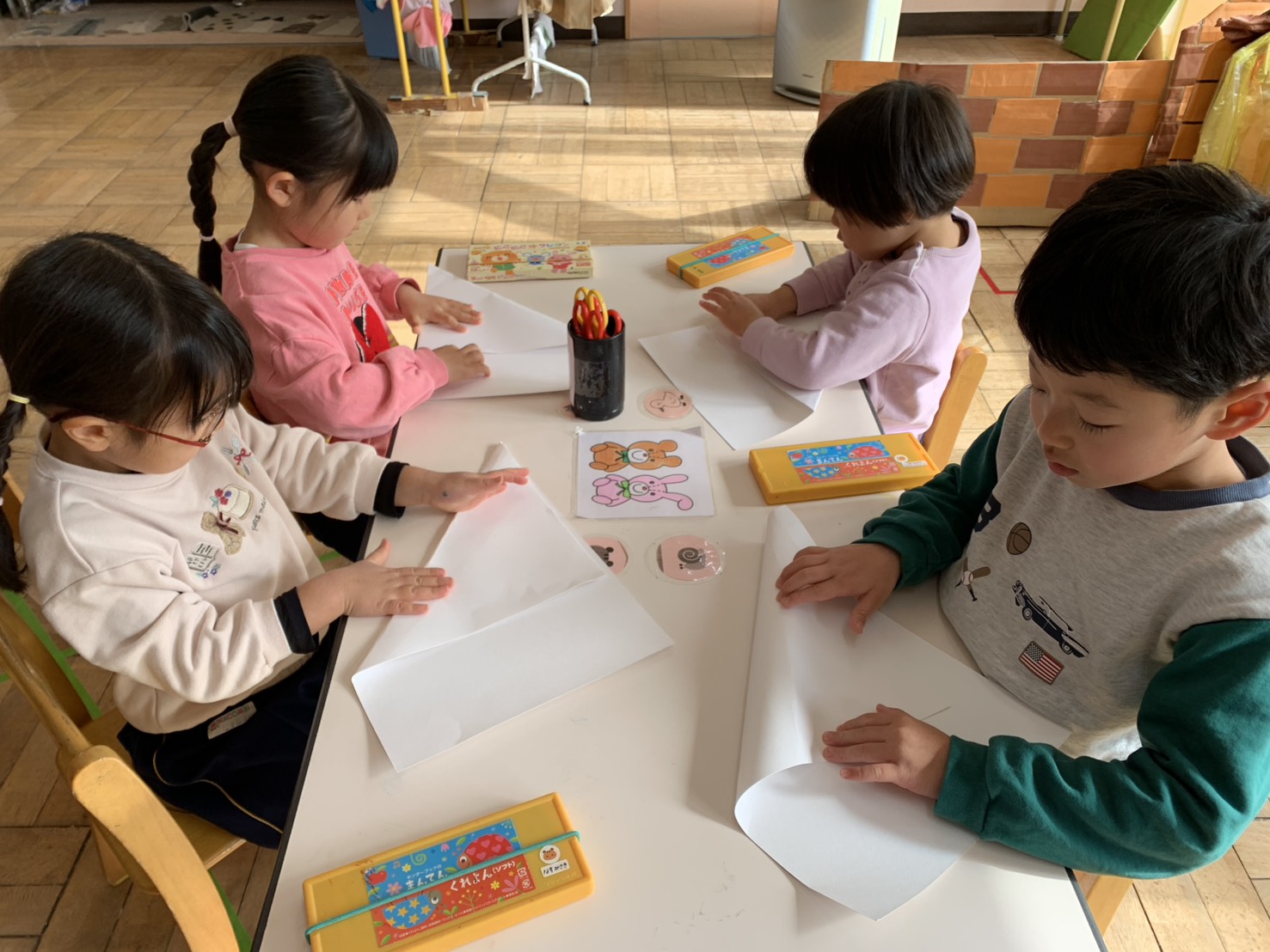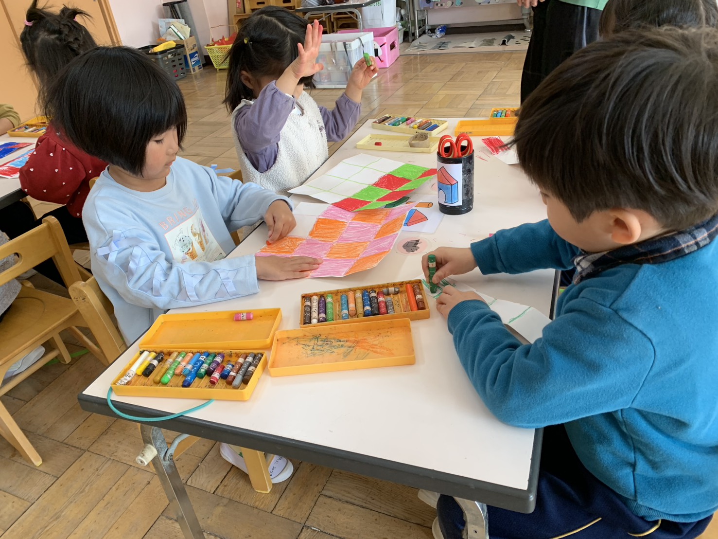 紙に折り目をつけ、クレヨンで綺麗に色塗りをしました☆
