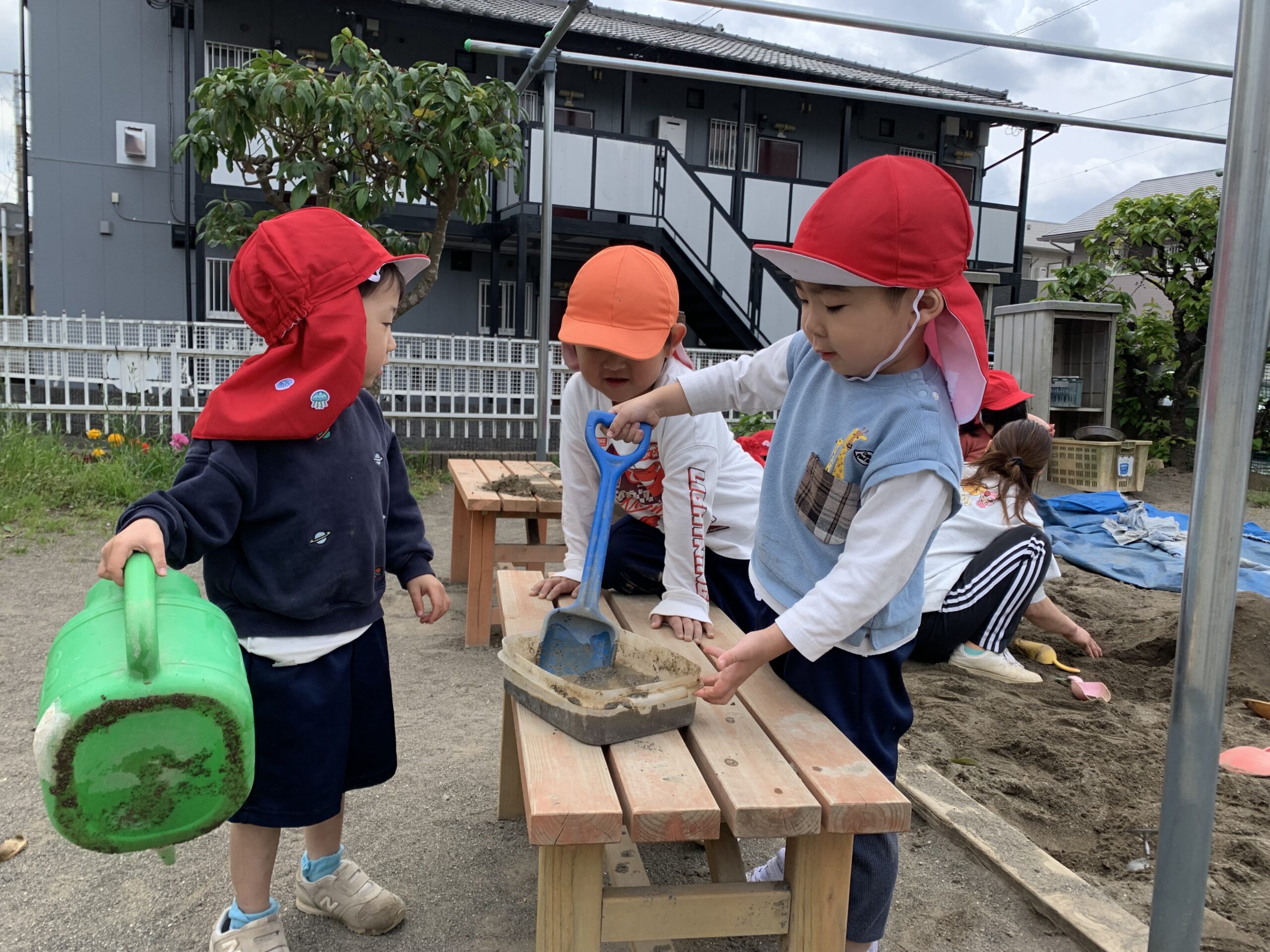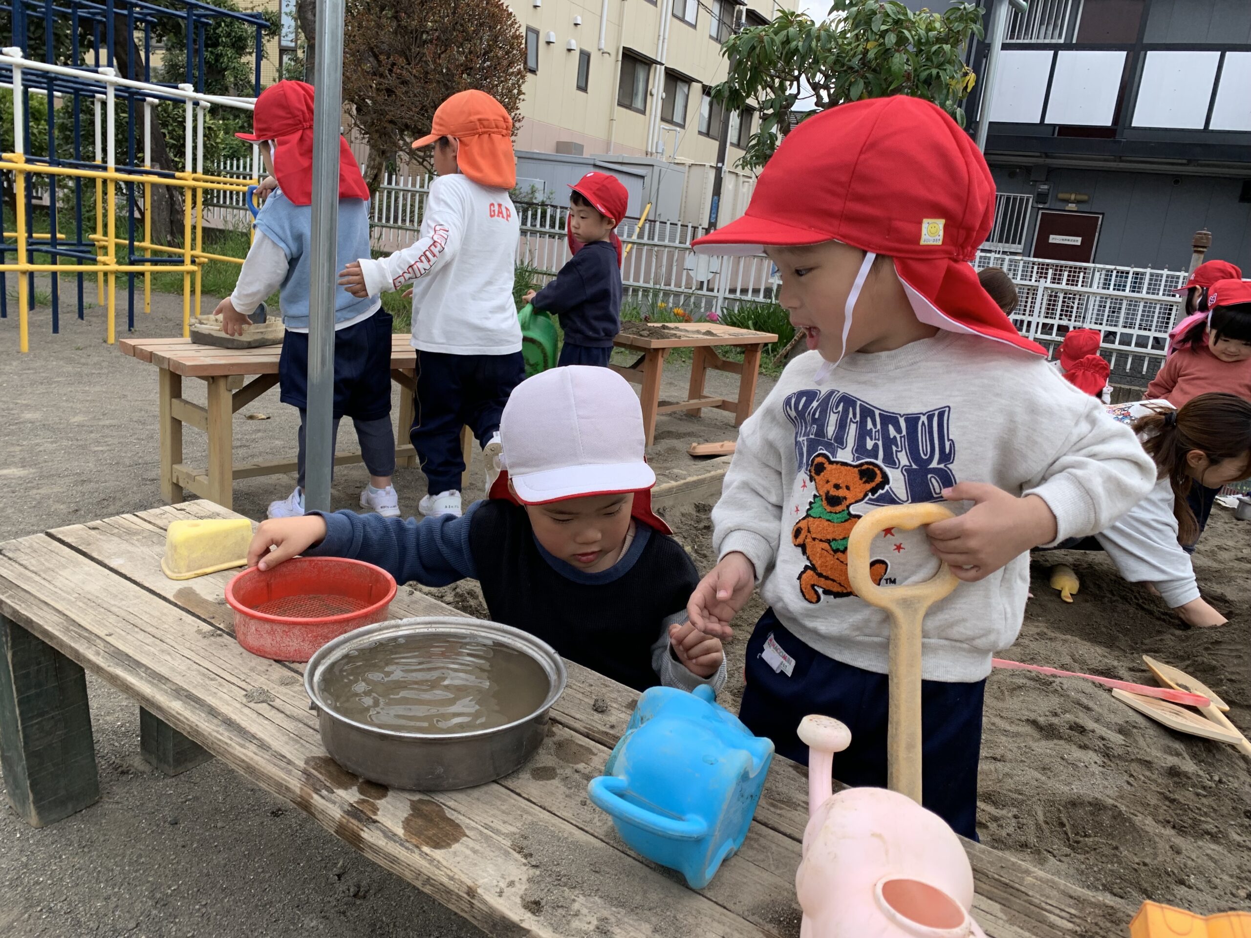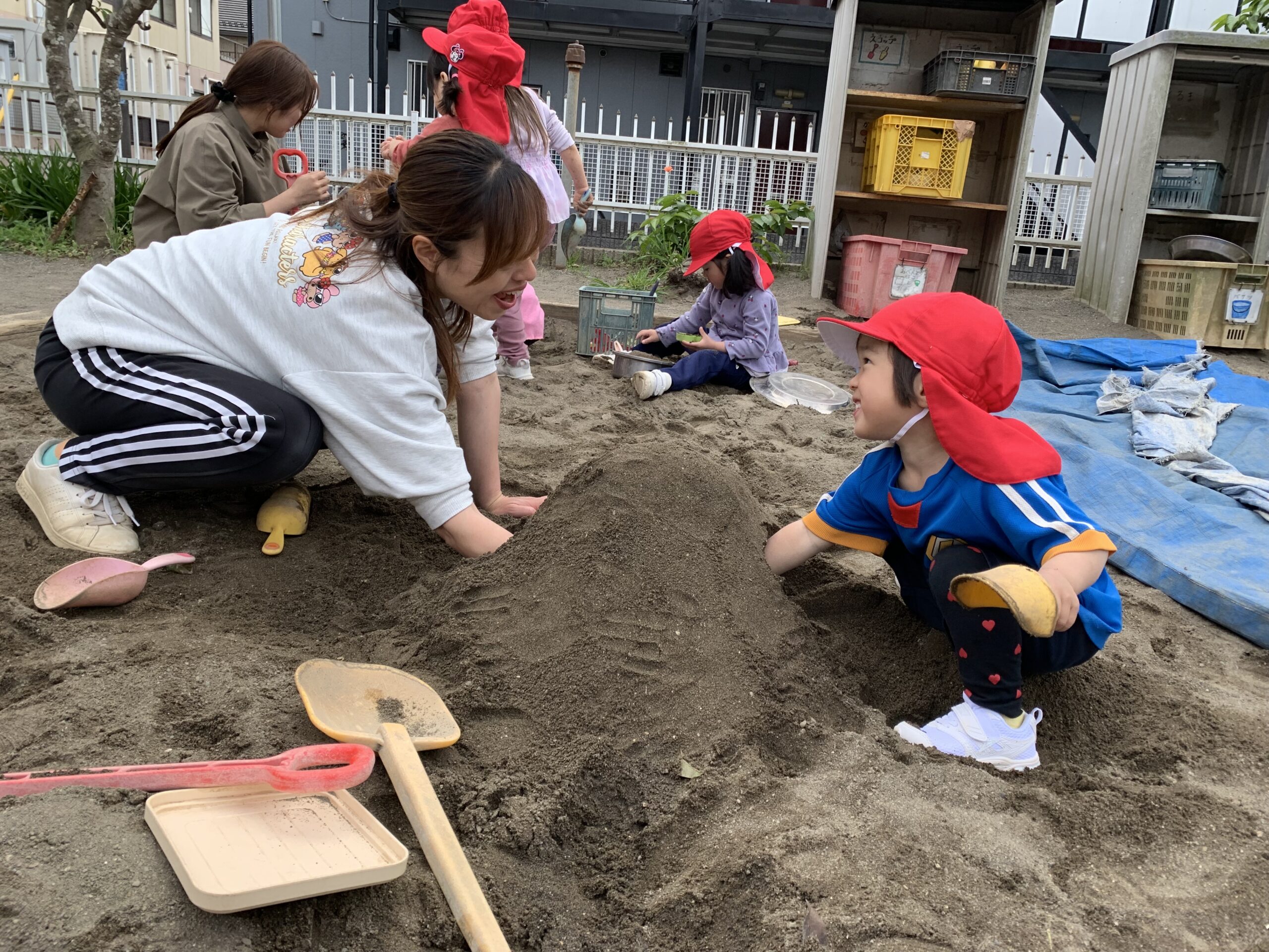 春のぽかぽか陽気の中、戸外のお砂場で笑顔いっぱい楽しく遊びました☆