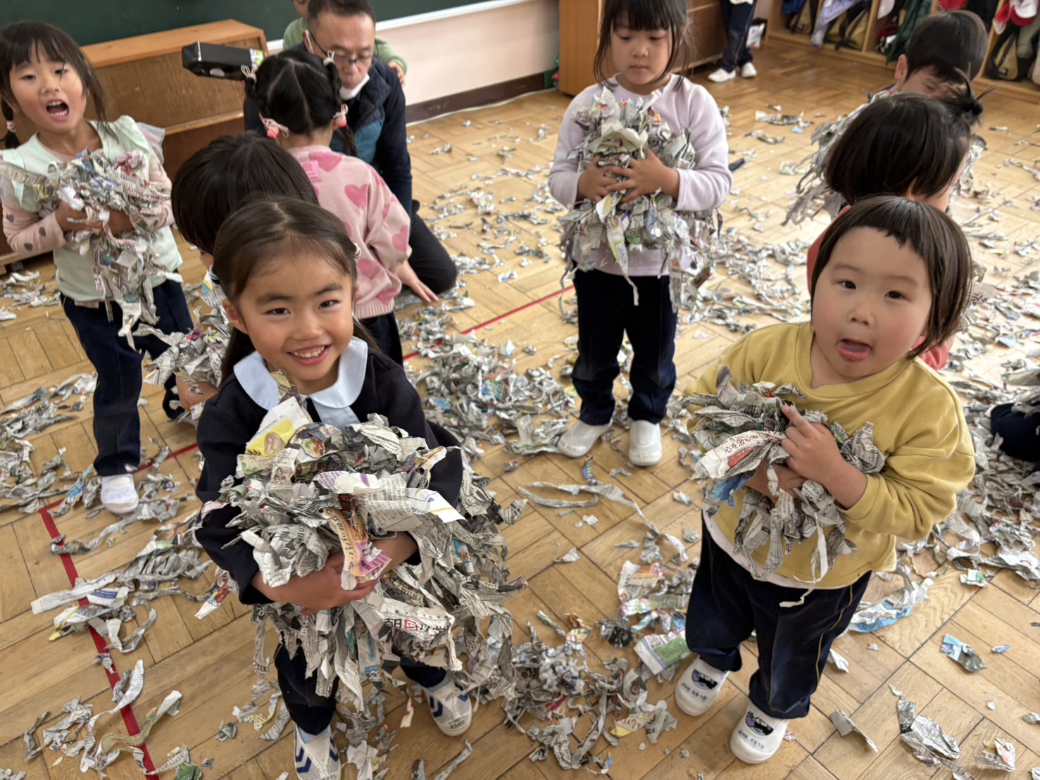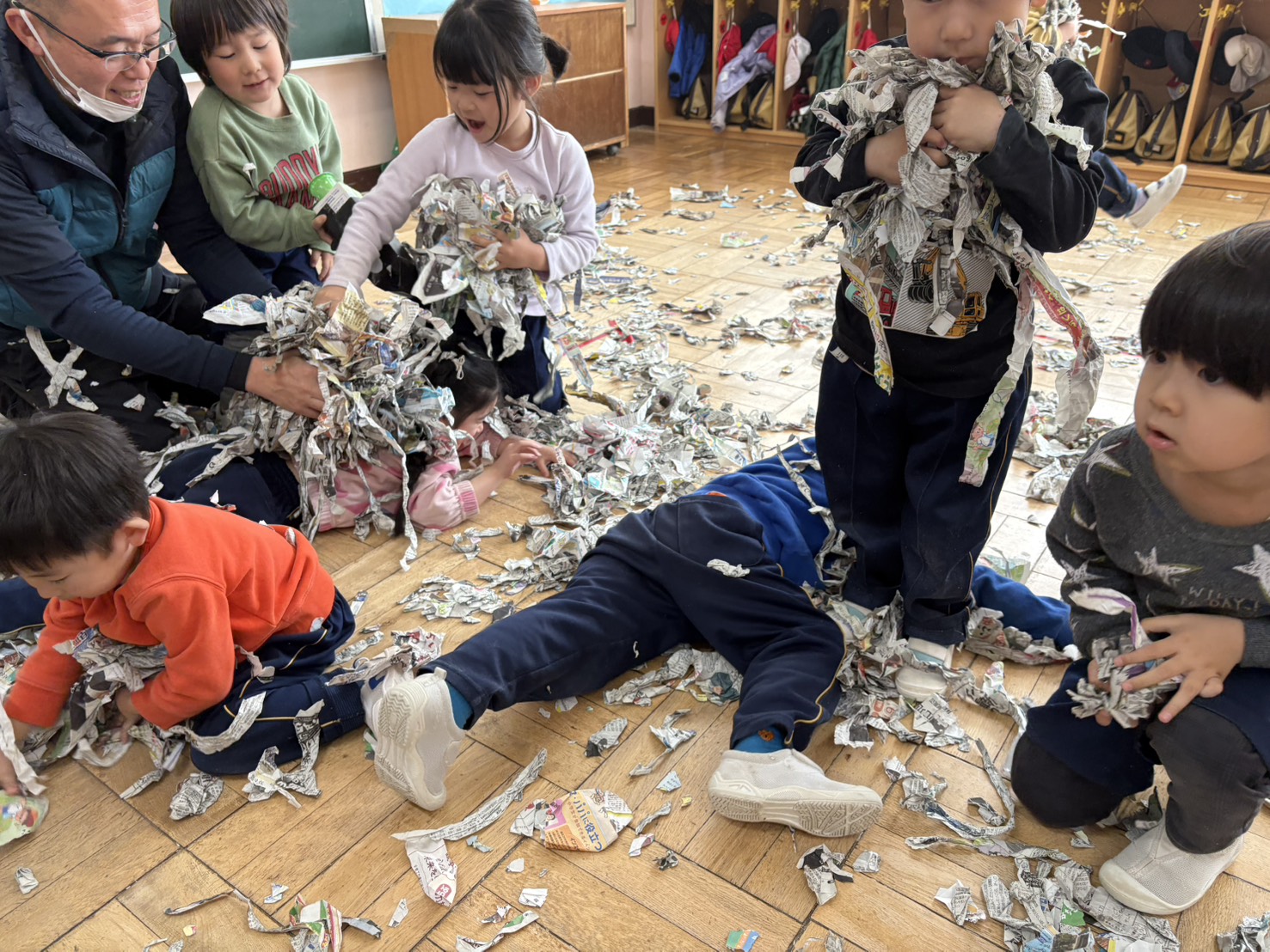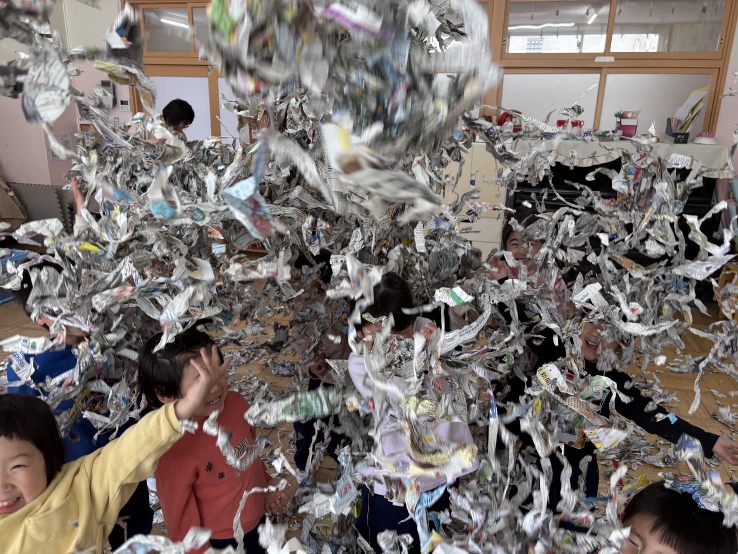 新聞紙をビリビリ破いてみんなで雨降らせました☆楽しかったね!