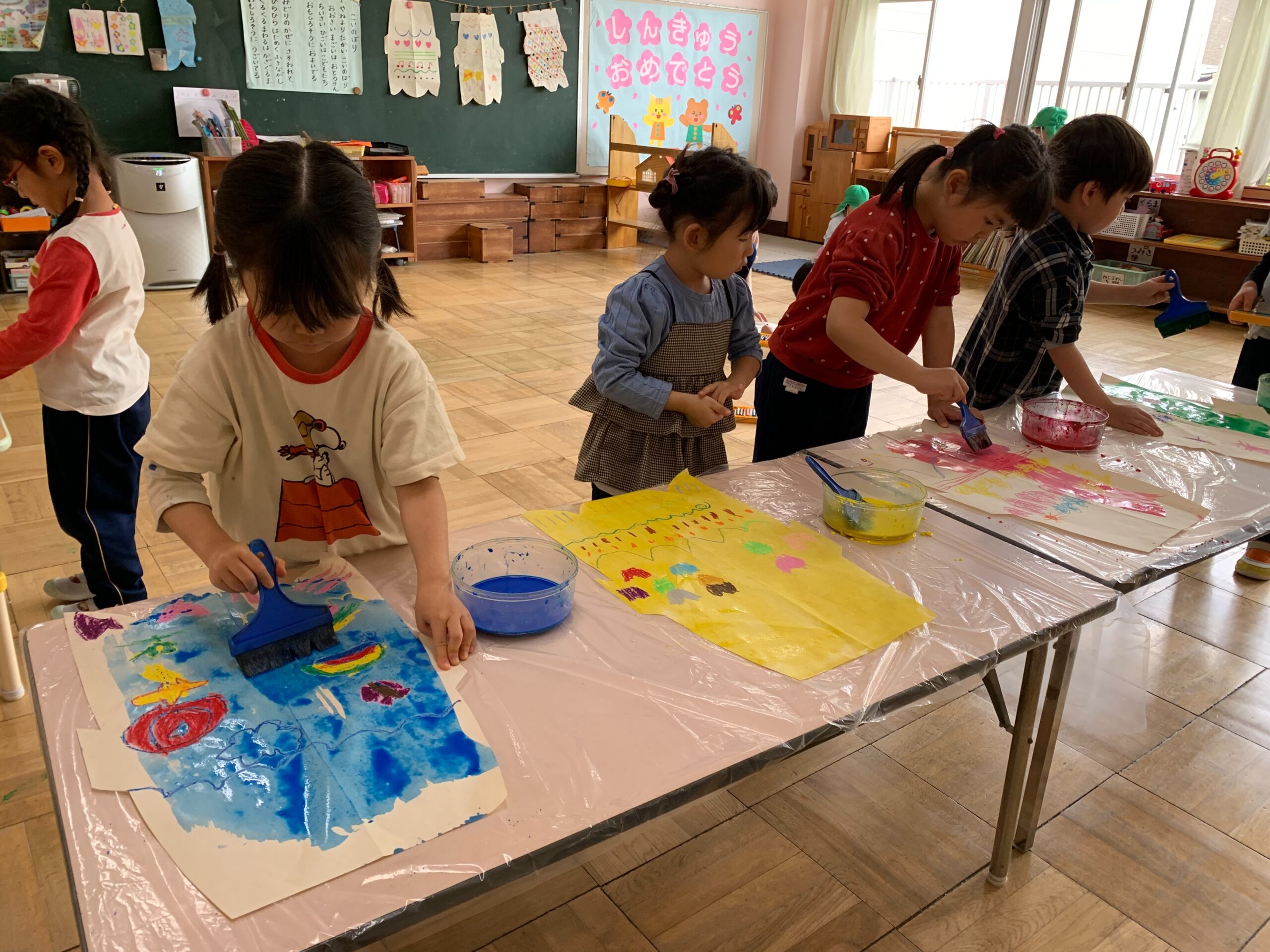 クレヨンで素敵な模様を描き、はじき絵でひごいを作りました!