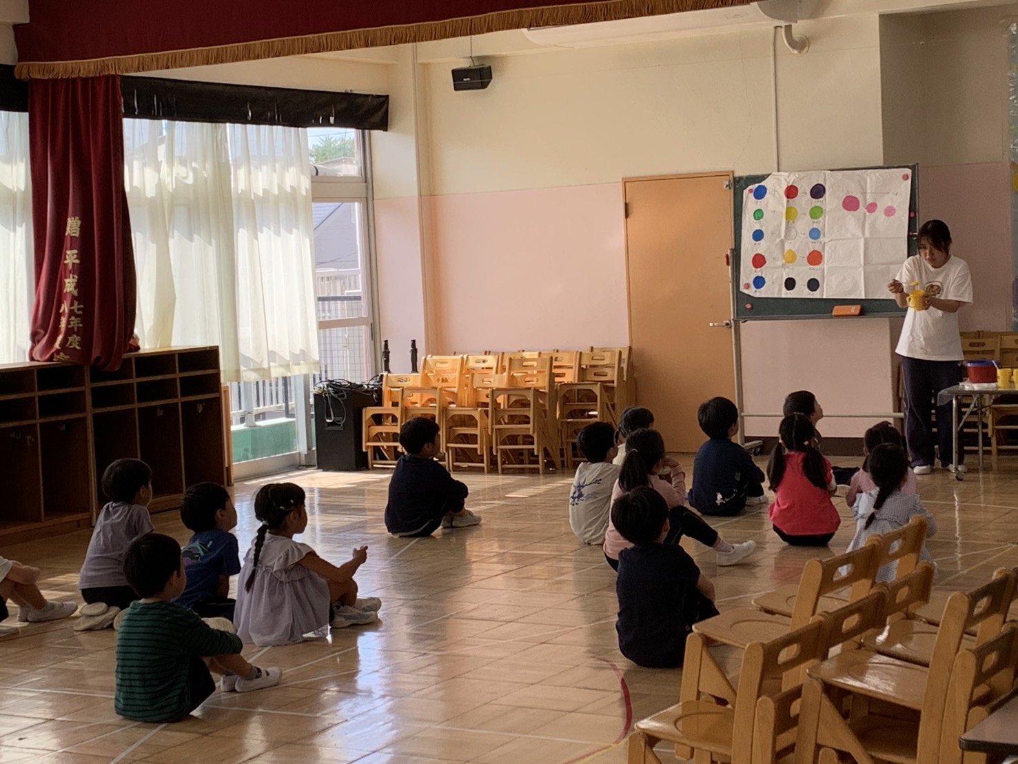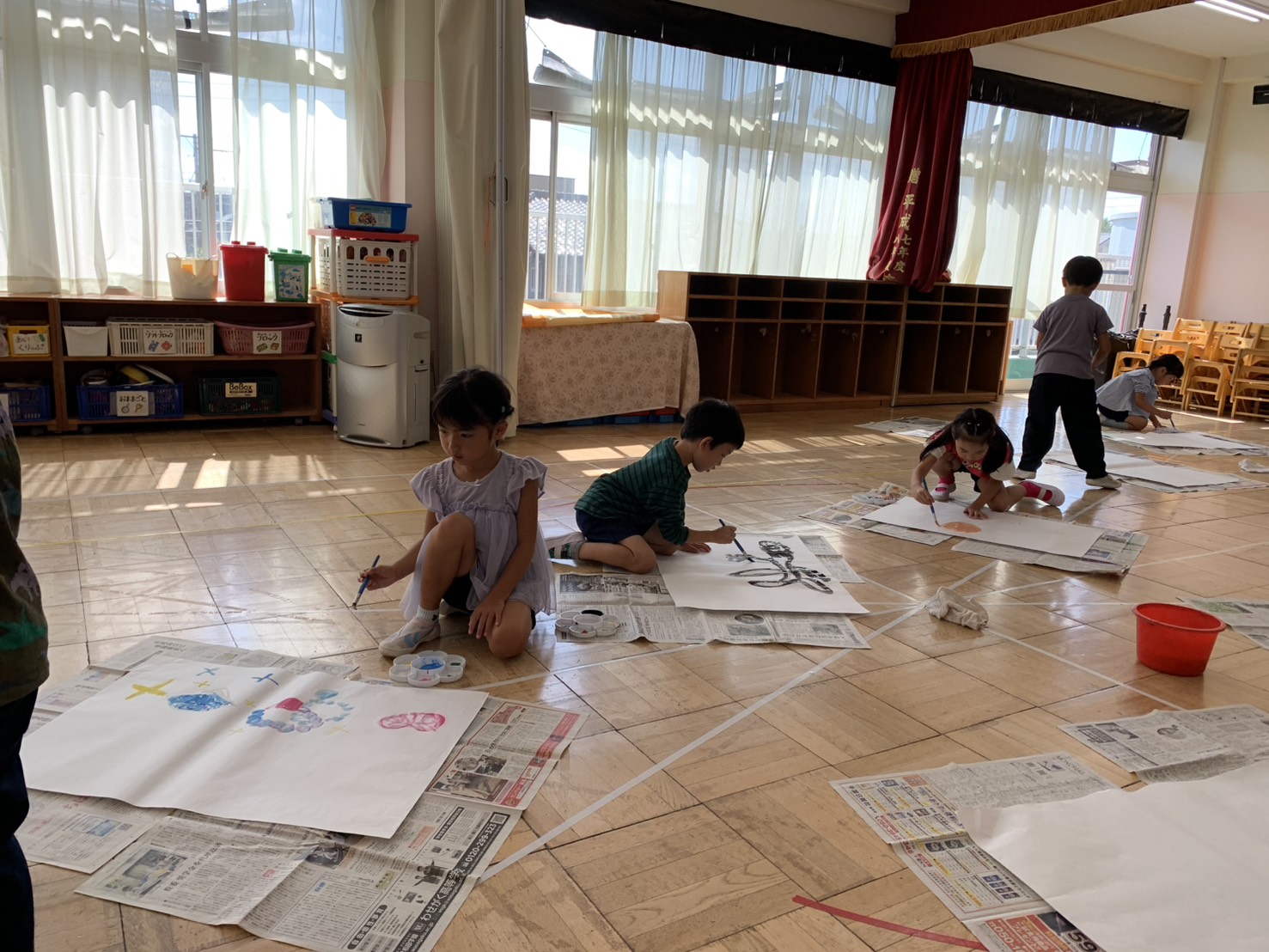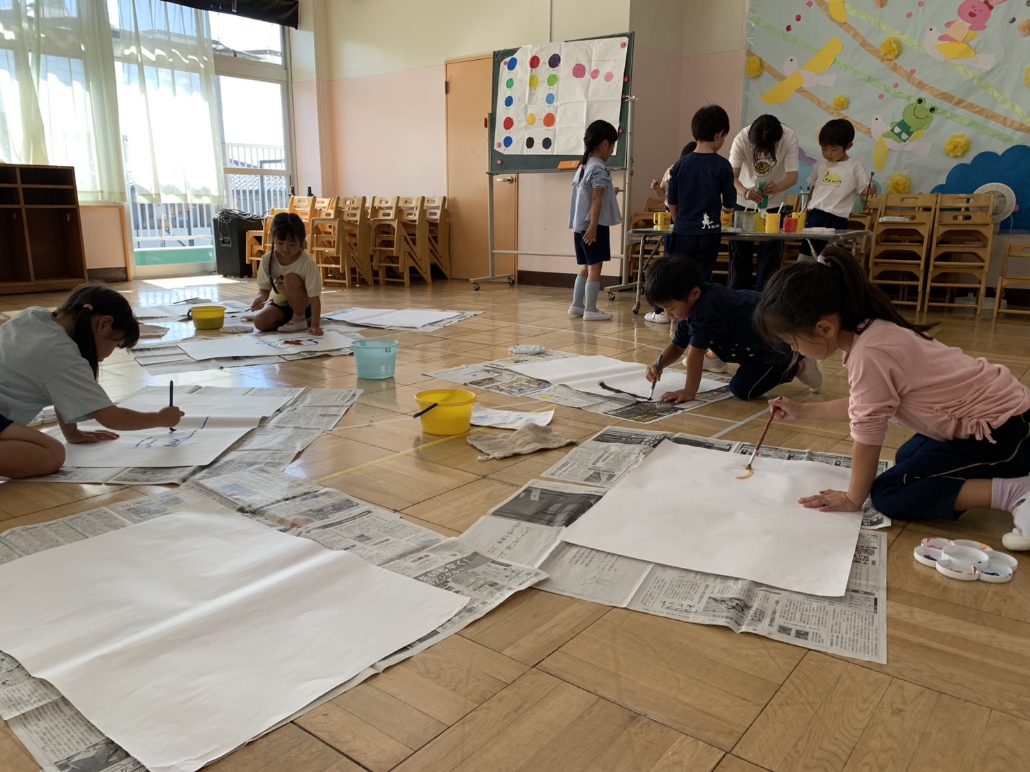 まつ組 絵の具絵 2025 年 10 月 10 日 絵の具を使って、のびのびと表現を楽しみました!色が混ざるおもしろさや、筆の動かし方を感じながら思い思いに描いていました。世界にひとつだけの素敵な作品がたくさんできあがりました☆