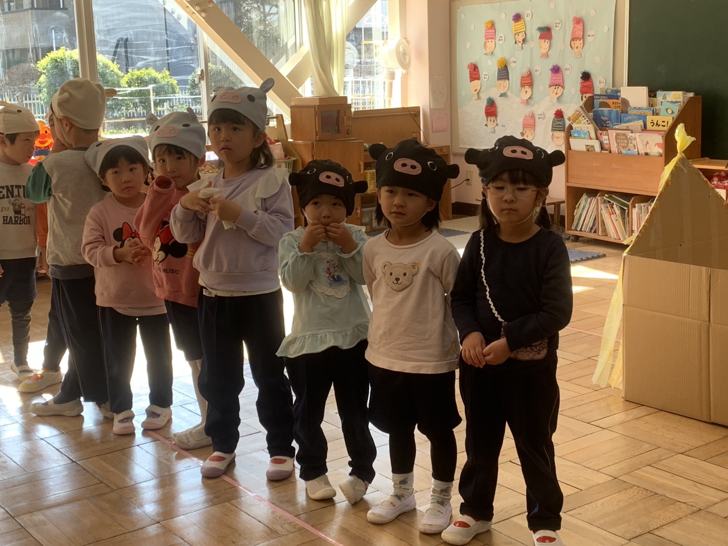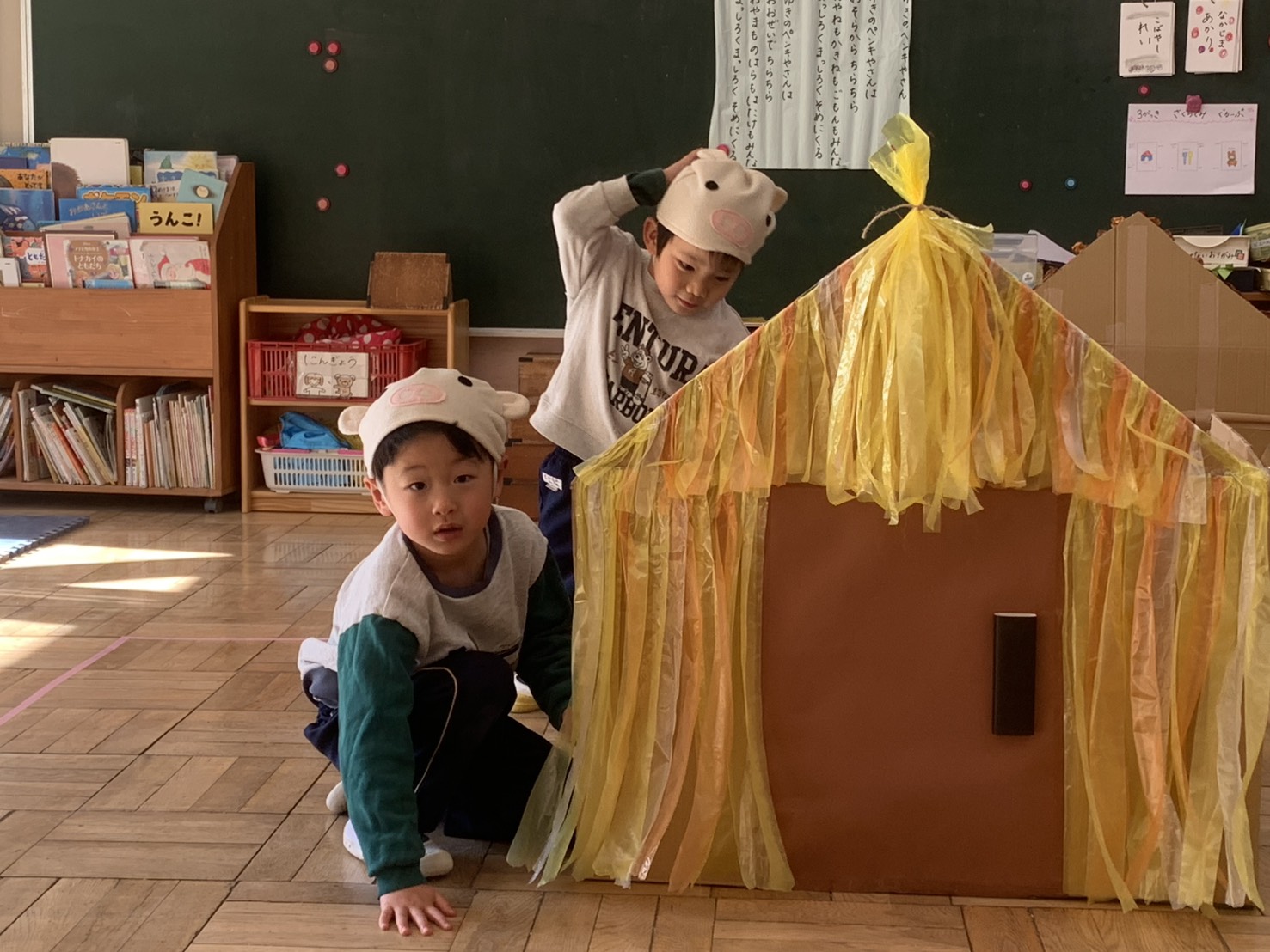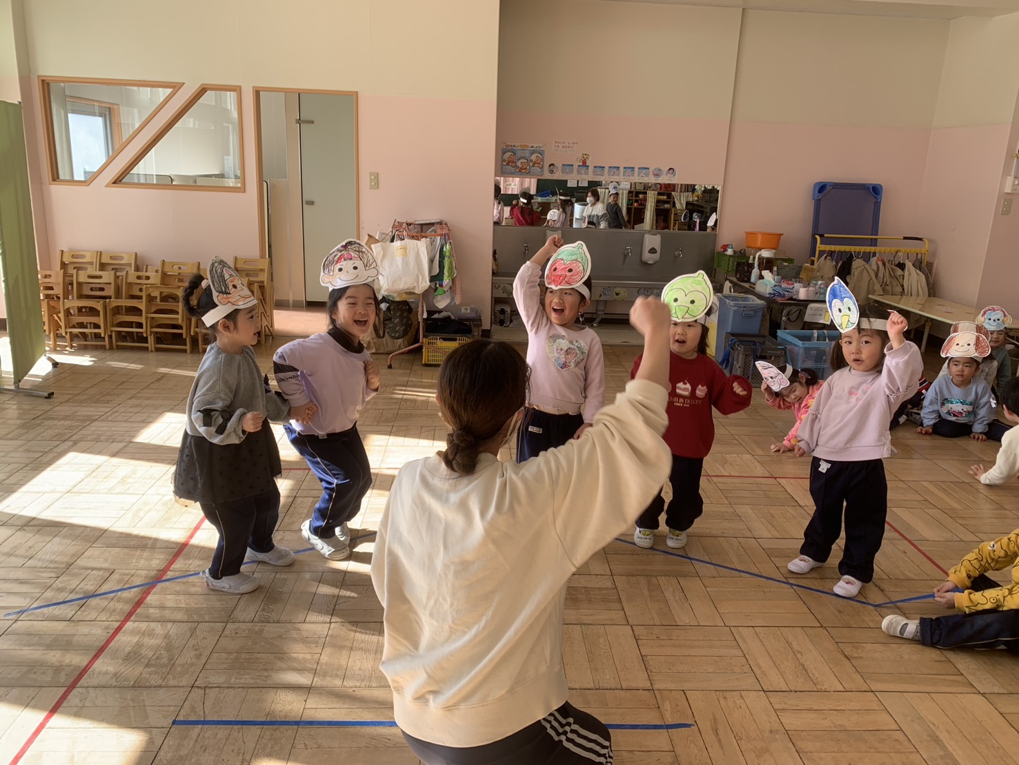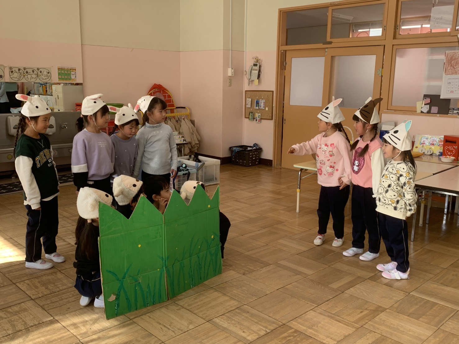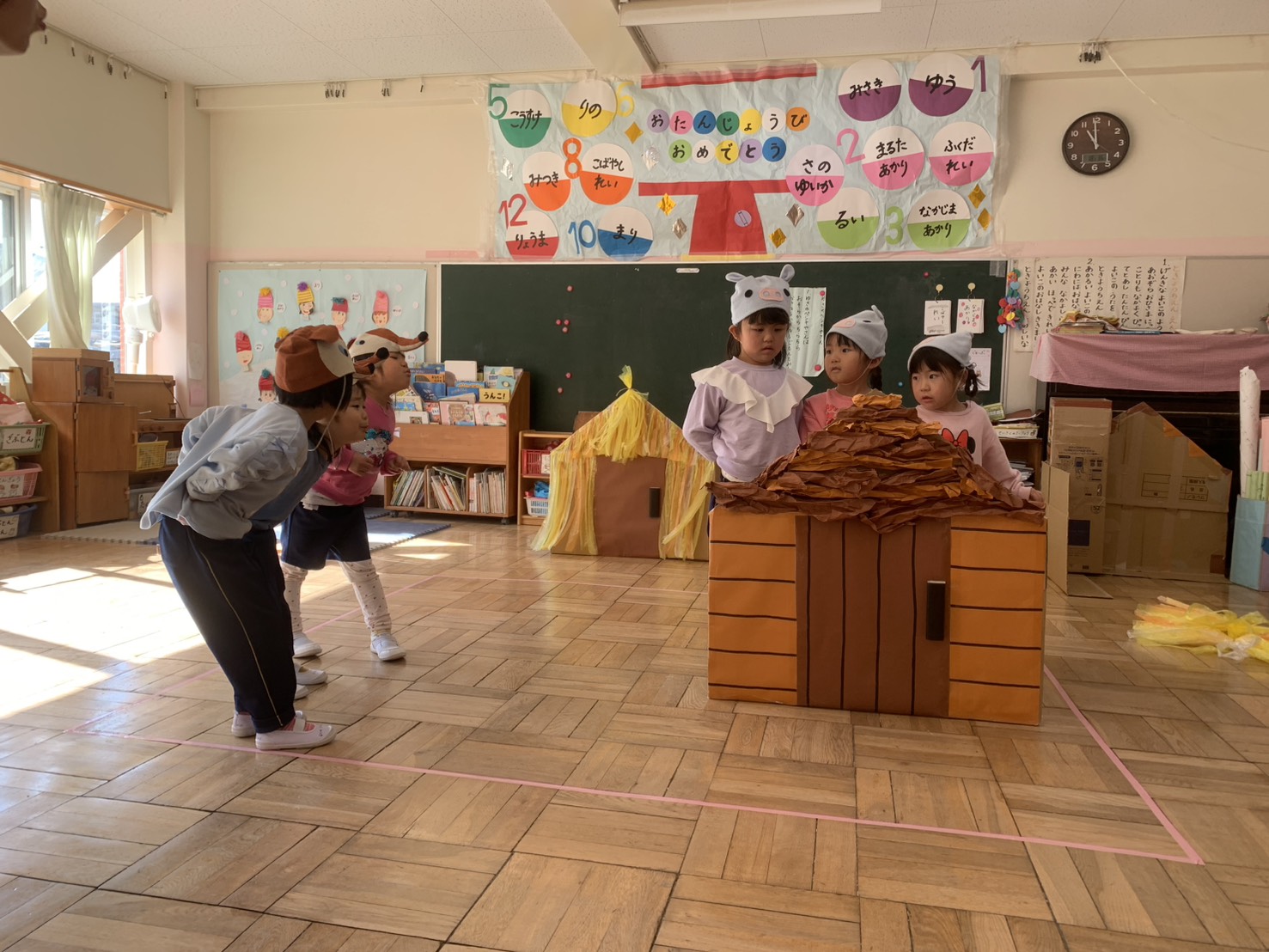 今日は先生たちにお客さんになってもらい、劇とリズムを行いました。ちょっぴり緊張しながらも、友だちと力を合わせて、楽しみながら取り組むことができました☆