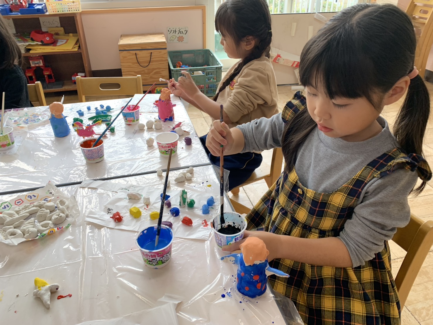 今日は紙粘土で作った小物に絵の具で色をつけました!