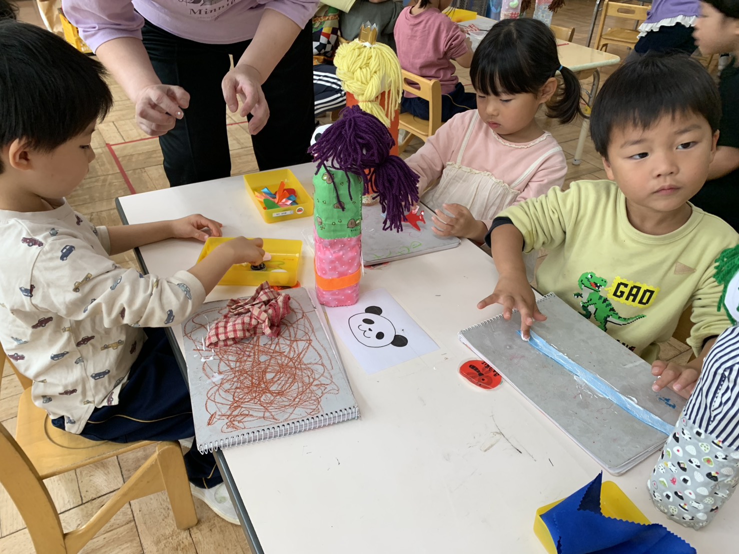 目や口をクレヨンで描いたり、飾り付けをしたりし、素敵な紙袋になりました♪